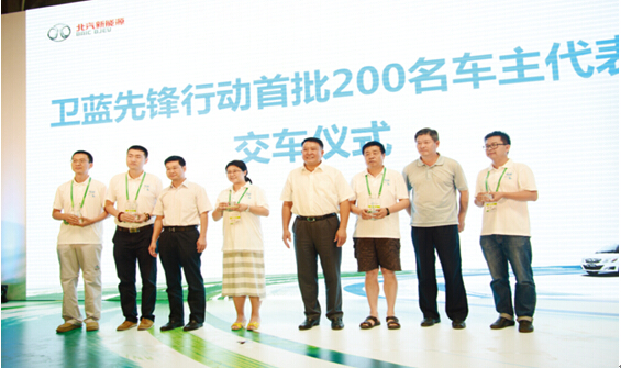 7 月13 日,“衛(wèi)藍(lán)先鋒行動(dòng)”首批200 名純電動(dòng)車(chē)主交付車(chē)輛儀式在北汽新能源公司舉辦。同時(shí)還聘請(qǐng)了潘曉婷、顧俊、高敏、楊凌等世界冠軍擔(dān)任“北京綠色出行大使”。北京市有關(guān)領(lǐng)導(dǎo)出席儀式,北汽集團(tuán)董事長(zhǎng)、副總經(jīng)理張欣,北汽新能源公司總經(jīng)理鄭剛一同參加活動(dòng)。將車(chē)鑰匙交給首批“衛(wèi)藍(lán)先鋒”車(chē)主代表,并向四位世界冠軍頒發(fā)了“北京綠色出行大使”聘書(shū)。