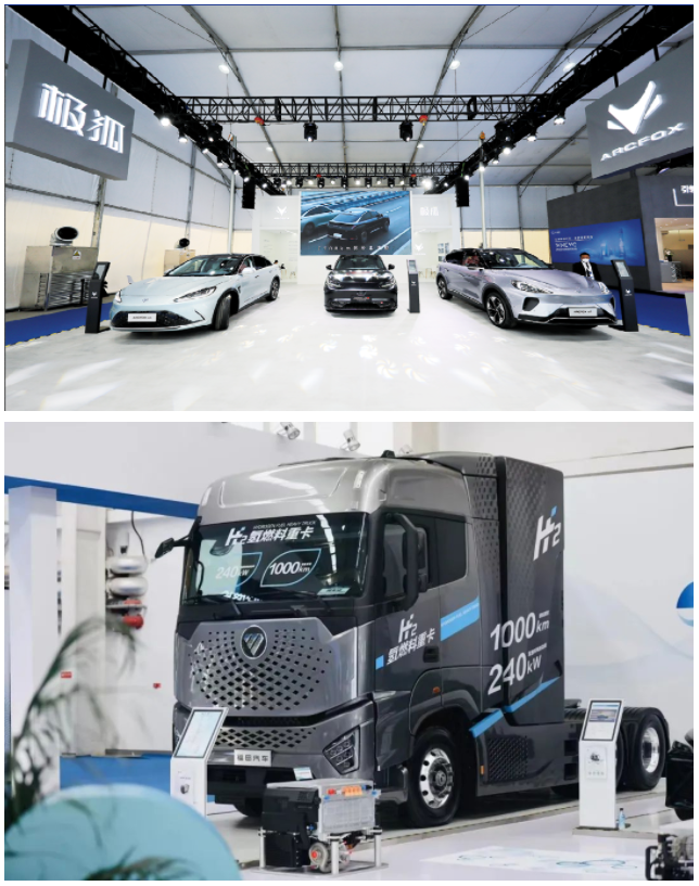 極狐汽車阿爾法T、阿爾法S、阿爾法S 全新HI版,福田70Mpa氫燃料客車(冬奧版)在大會重磅亮相,北汽集團旗下的綠色科技產品跨越乘商兩棲。